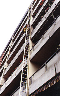 Infälld - en diskretlist Utfälld - en stadig stege Inbrottskydd - kan ej öppnas av obehöriga. Fallskydd - säkerhetssele. Utförande - Funktion Stegen är utförd i anodiserad aluminium och med bult/skruv i syrafast rostfritt. Stegpinnarna är ledbart infästande i sidoprofilerna vilket gör att de göms i sidoprofilerna i infällt läge och låses i vinkelrät position i utfällt läge. En extra trygghet på arbetsplatsen Genom att sätta upp flera stegar får man ännu bättre utrymningsmöjligheter då personalen/hyresgästen alltid har nära till en stege Hotellsäkerheten I hotell och restaurangerbranschen ökar medvetenheten och vikten av att kunna erbjuda sina gäster en hög brandsäkerhet. Alternativa, säkra utrymningsvägar är en viktig del i detta.
